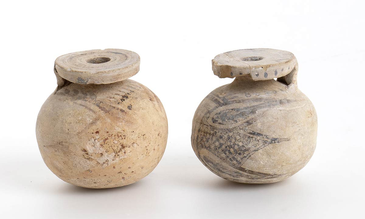 VI secolo a.C.; alt. luno cm 7; Tracce di decorazione, forse a petali di fiore di loto. Uno dei due presenta un piccolo restauro sul labbro.
