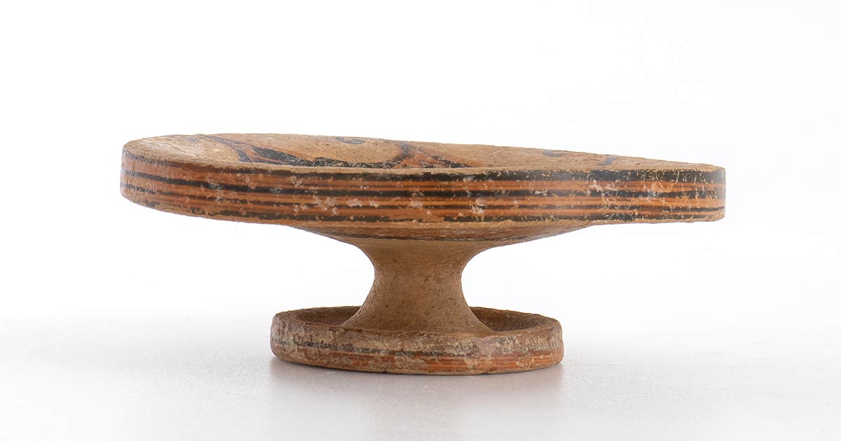 IV secolo a.C.; alt. cm 5,3; diam. cm 15; Meandro ad onda sul labbro, all'interno della vasca profilo femminile verso sinistra. Evidenti cadute di colore, tuttavia integro, con graffito sul fondo del piede.