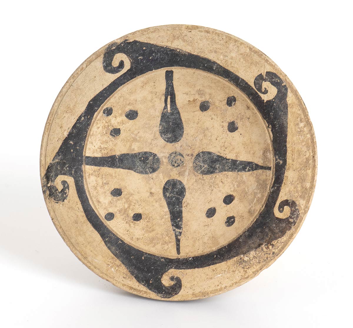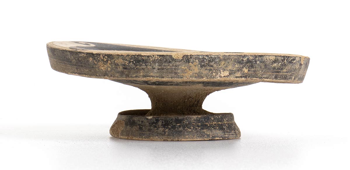 IV secolo a.C.; alt. cm 5; diam. cm 14; Meandro ad onda sul labbro, all'interno della vasca motivo a stella a quattro raggi. Intatto.