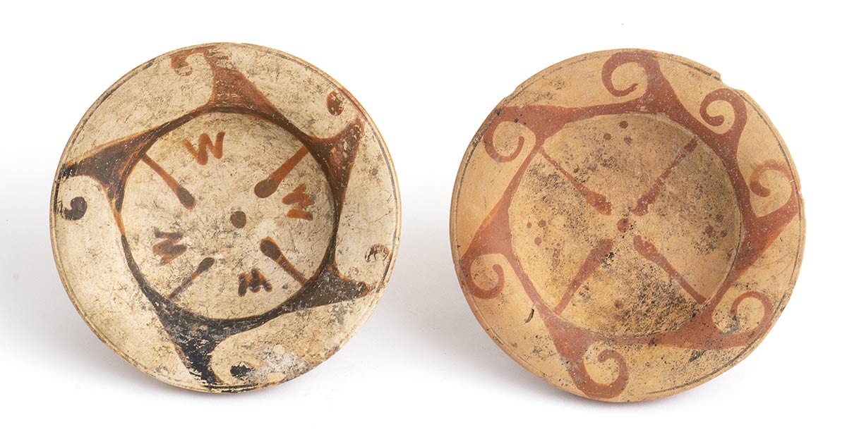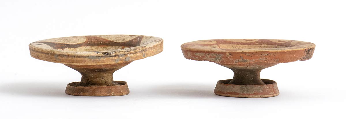 IV secolo a.C.; diam. max cm 14; alt. max cm 5,2; Entrambi decorati con meandro ad onda sul labbro e motivo a stella a quattro raggi all'interno della vasca. Uno dei due presenta il piede restaurato.
