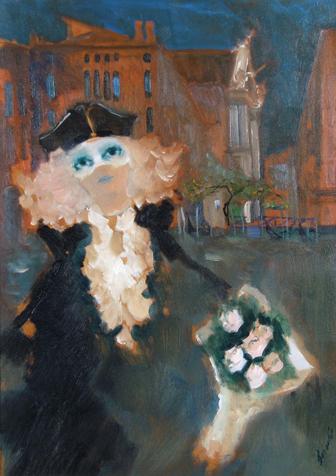 BORSATO RENATO Venezia 1927 Un giorno di carnevale olio su tela 70x50 cm firma in basso a destra firma e titolo al retro