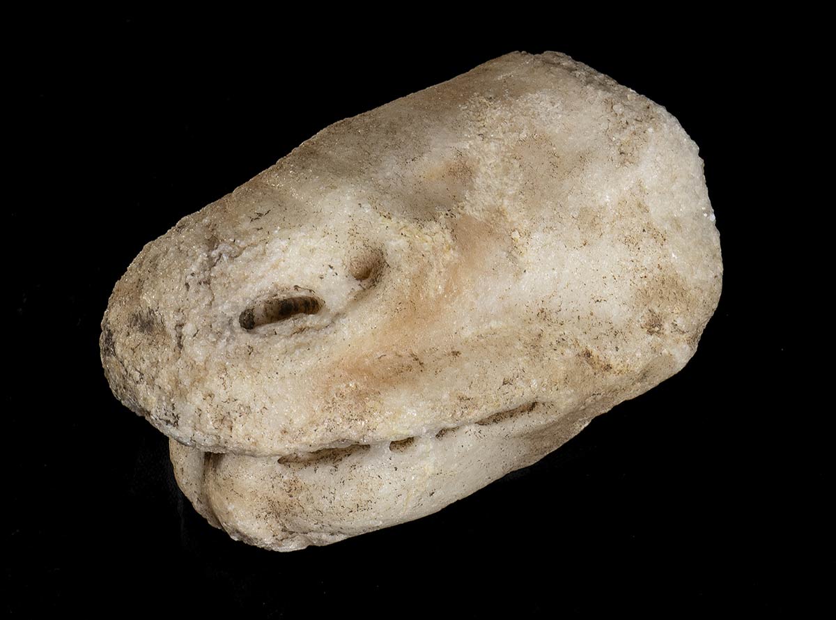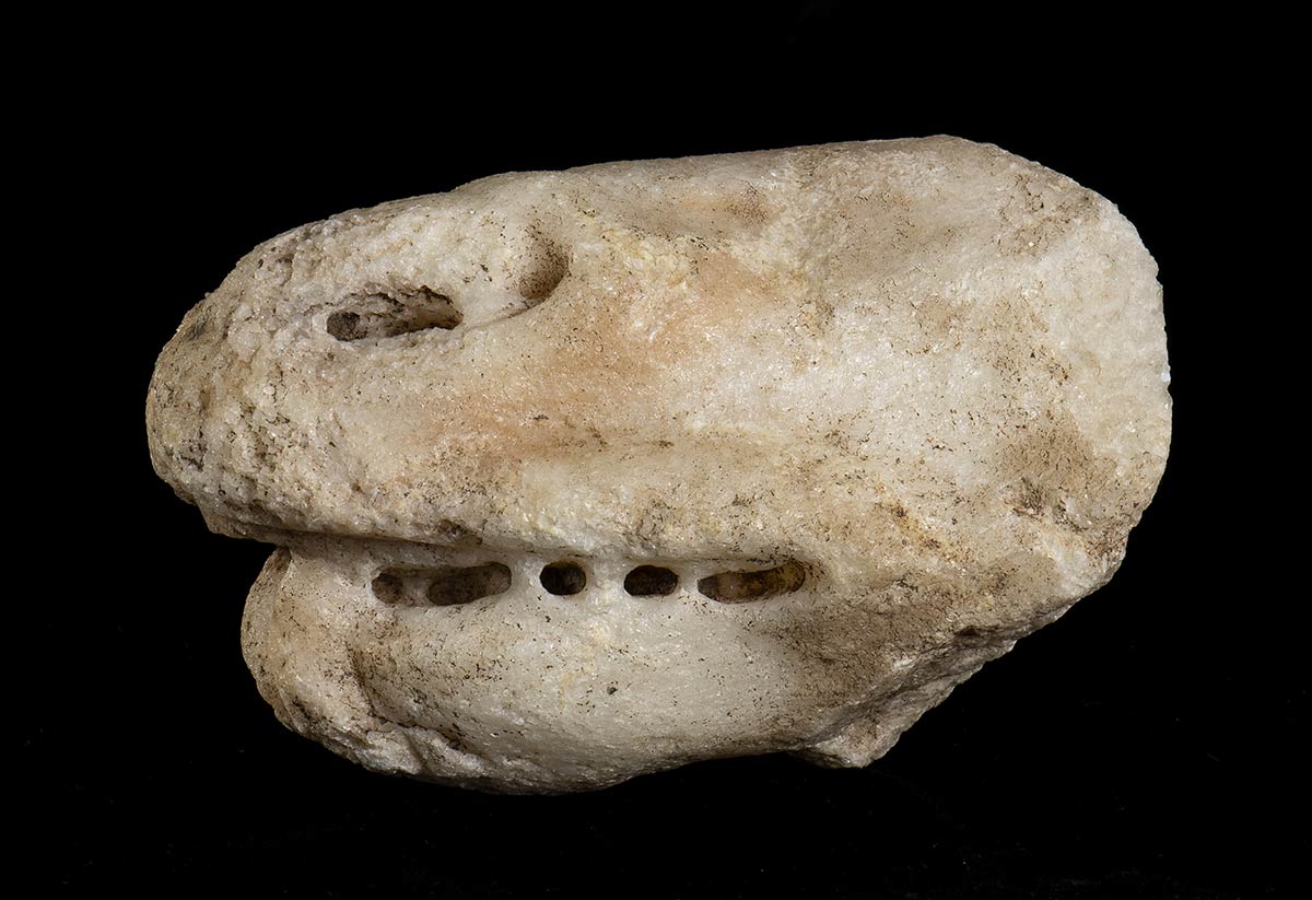 II secolo a.C. - I secolo d.C.; lungh. cm 12; alt. cm 7; Frammento di serpente-dragone scolpito nel marmo greco, con denti aguzzi e lingua biforcuta che fuoriesce dalle fauci.