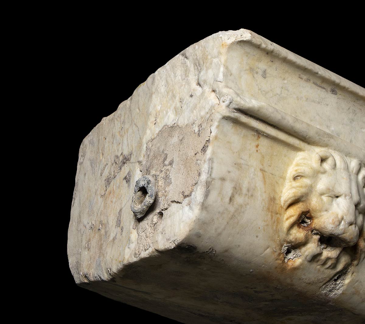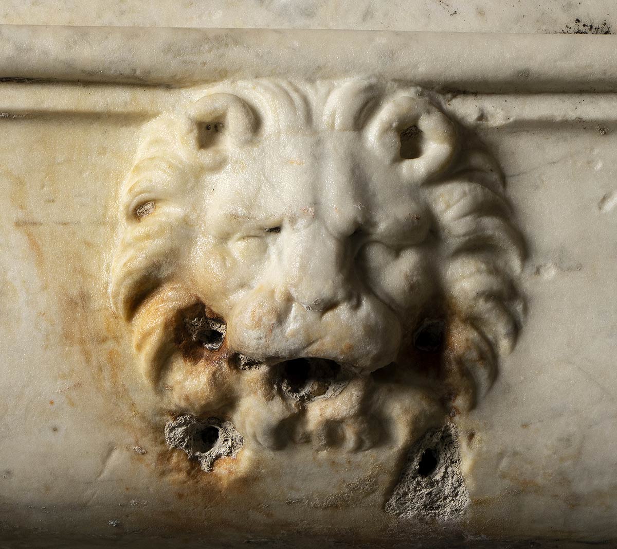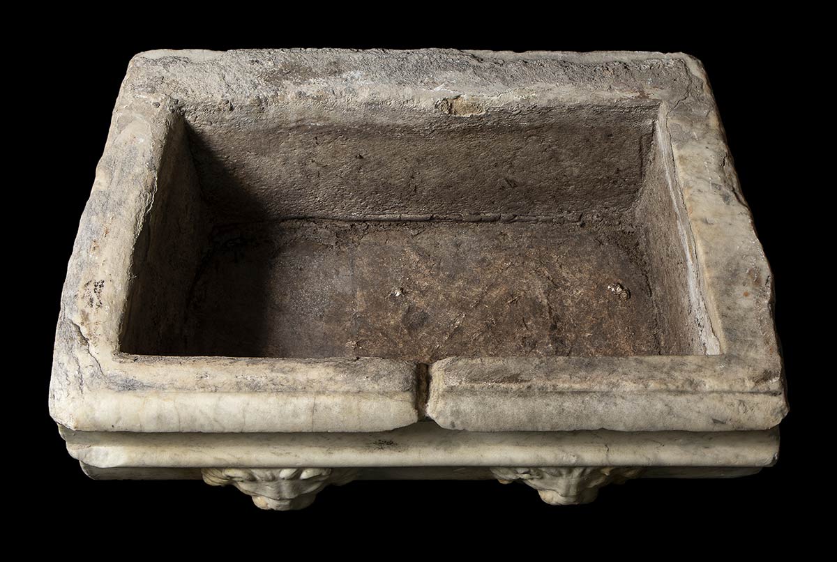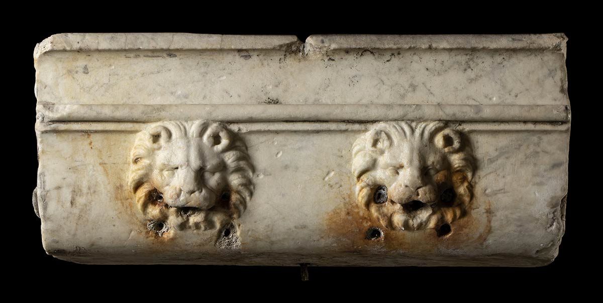 I secolo a.C. - I secolo d.C.; lungh. cm 65,5; alt. cm 28; prof. cm 41,5; bordo spesso ca. cm 6; Eccezionale, rarissima, fontana di epoca romana a pianta trapezoidale scolpita nel marmo pentelico. Sulla fronte, due sbocchi in forma di teste di leone con le fauci aperte. Sul lato sinistro si conserva parte della fistula in piombo per l'approvvigionamento idrico; sulla fronte sono le tracce di antichi ossidi di ferro e fori postumi eseguiti per agevolare l'uscita dell'acqua.