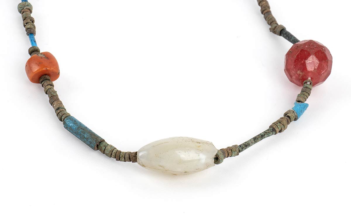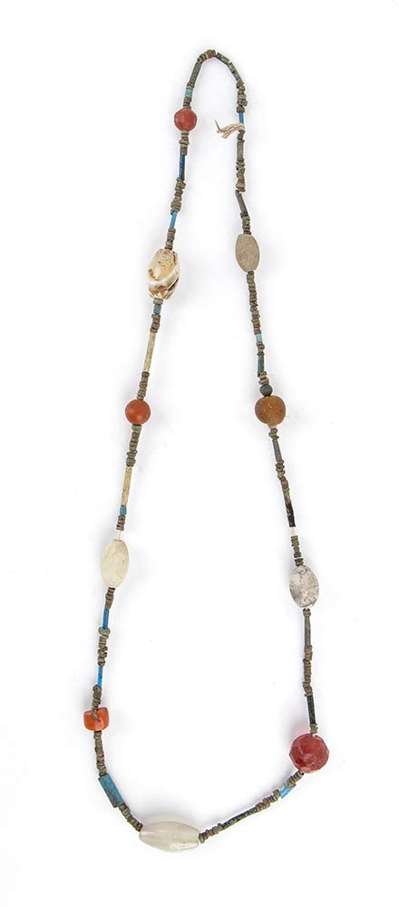 Pastiche di vaghi antichi, dal VIII secolo a.C. ca.; lungh. filo cm 75; Collana composta da vaghi antichi in faience, corniola, agata fasciata e corallo.
