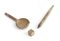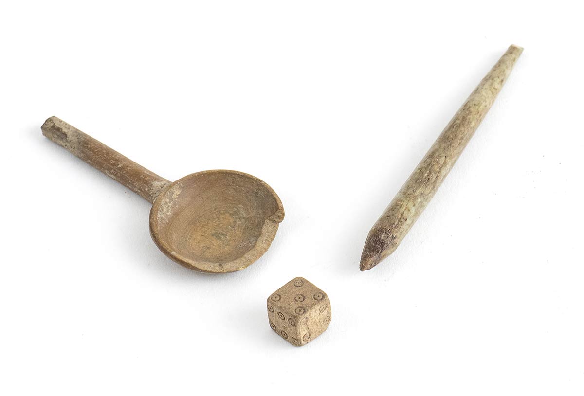 I - II secolo d.C.; lungh. max cm 7,8; Un cucchiaio da cosmesi, uno stilo, un dado da gioco.
