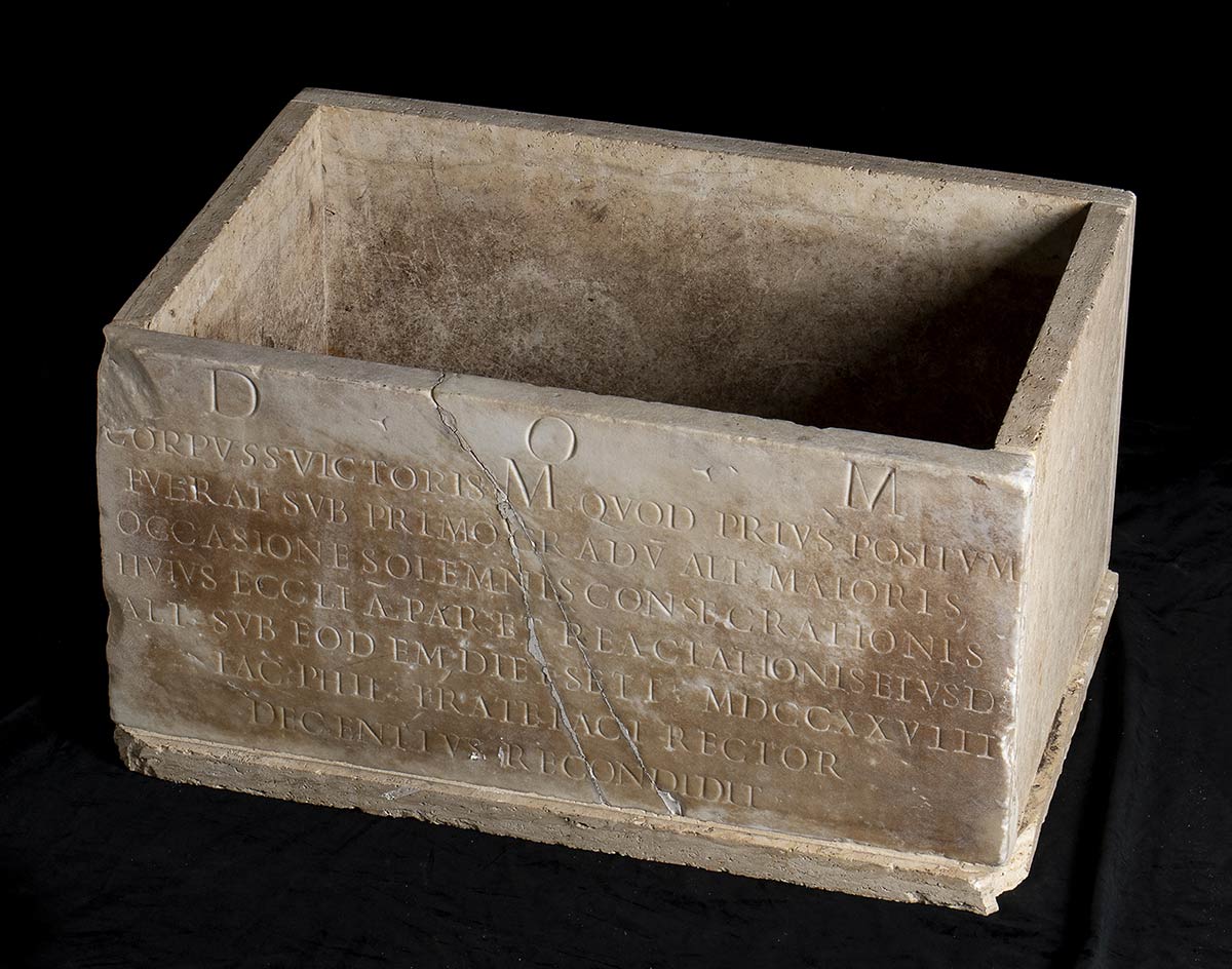 XVIII secolo, datata 1728; fioriera cm 65,5 x 44,5; alt. 34,5; lungh. epigrafe cm 65, alt. cm 31,5, spessore cm 3,5 ; La lastra è stata riutilizzata per una moderna fioriera. Doppia crepa centrale restaurata.