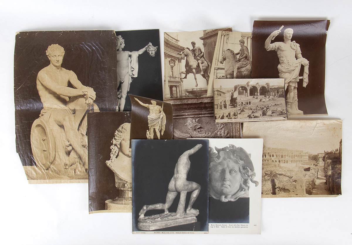 Lotto di più di dieci stampe fotografiche intestate con reperti archeologici e viste di antichità, 1880-1910 circa