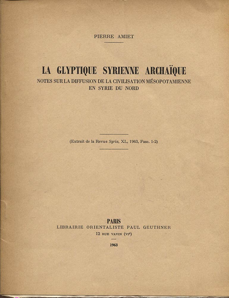 AMIET P. – La Glyptique syrienne archaique; notes sur la diffusion de la civilation mesopotamienne en Syrie du nord. Paris, 1963. Pp. 58 – 83, tavv. 2. + 32 ill. nel testo. ril. ed buono stato, importante.