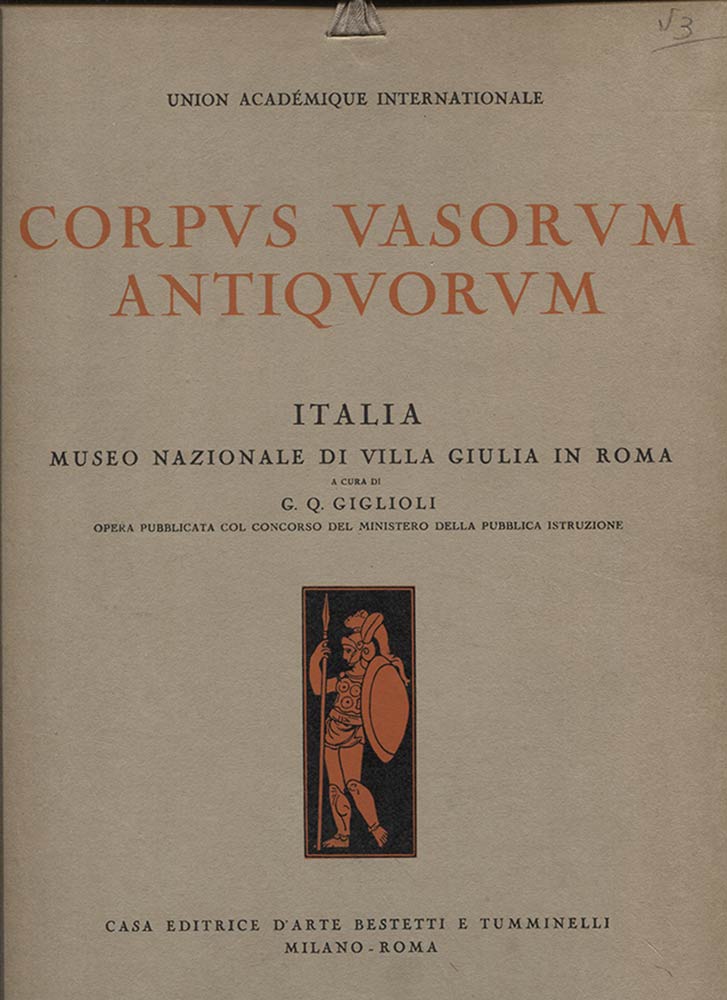 GIGLIOLI G. Q. - Corpvs Vasorvm Antiqvorvm. Italia ; Museo Nazionale di Villa Giulia in Roma. Fasc. 3. Roma, 1925\28. Pp. 37, tavv. 99 – 147. Ril ed. ottimo stato, molto raro in ed originale.