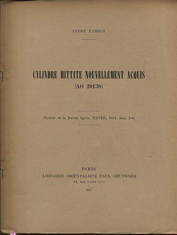 PARROT A. – Cylindre hittite nouvellement acquis ( AO20138). Paris, 1951. Pp. 180 – 190, tavv. 2 + ill. nel testo. ril. ed. buono stato.