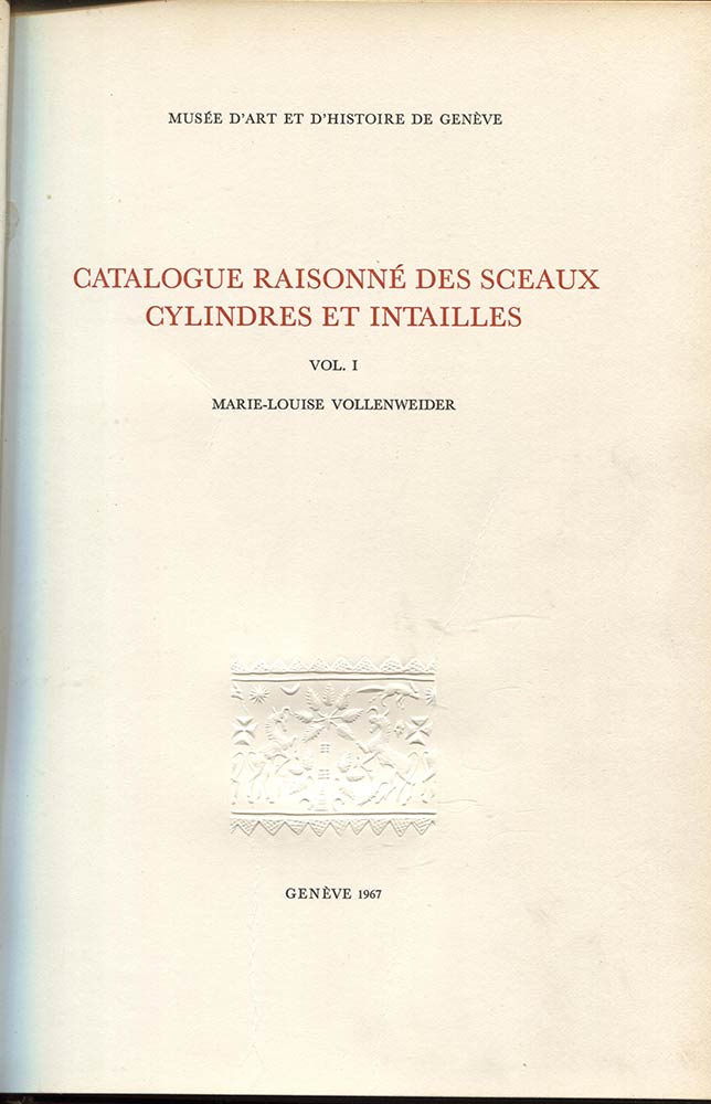 VOLLENWEIDER M.L. – Catalogue raisonne des sceaux cylindres et intailles. Vol. I. Geneve, 1967. Pp. 217, tavv. 95. Ril. ed. tutta pelle, dorso sciupato, buono stato, importante e raro.