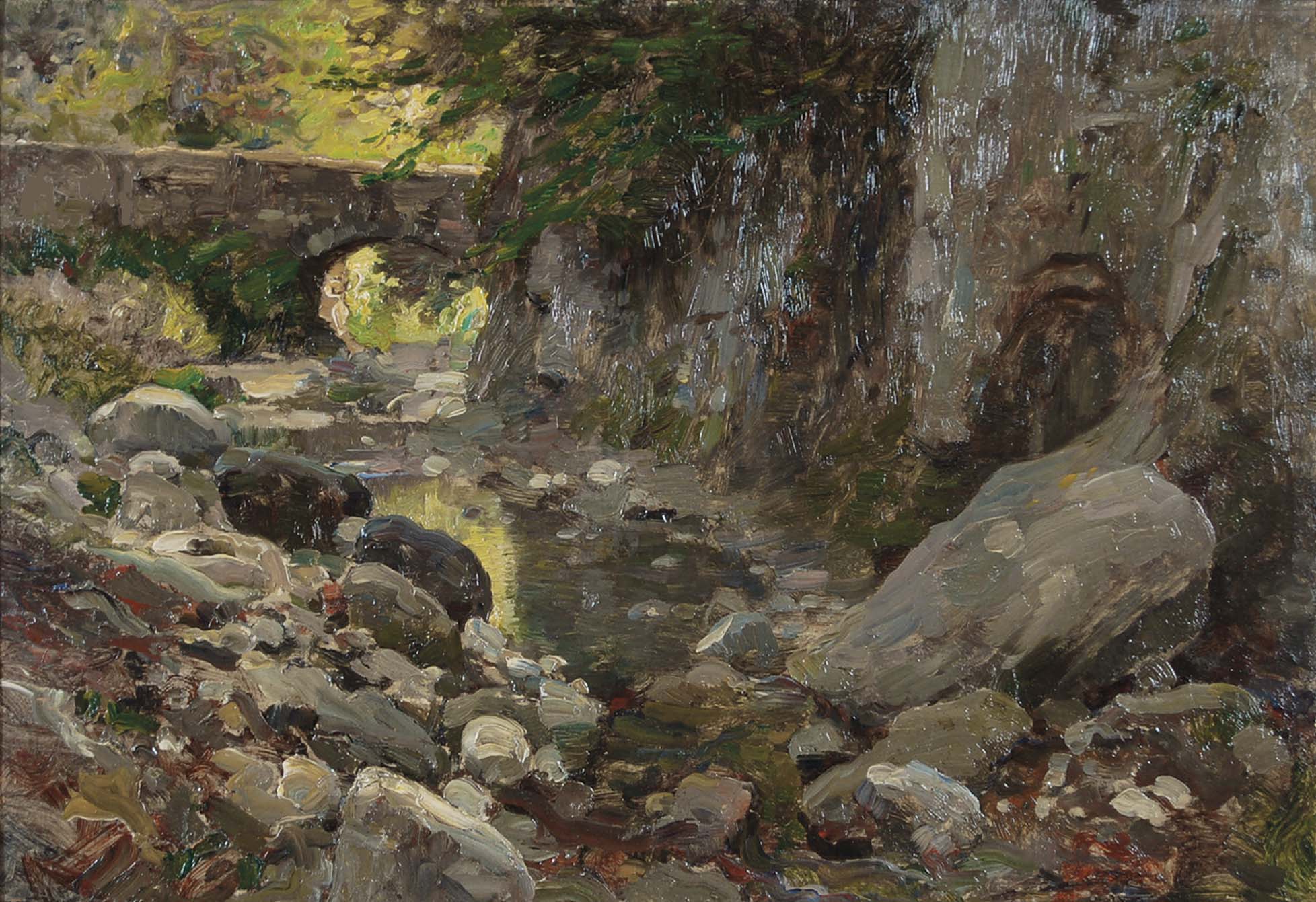 MAZZETTI EMO Treviso 1870 - Venezia 1955 Torrente in Cadore olio su tavola 29,5x43 cm firma in basso a sinistra provenienza eredi Mazzetti