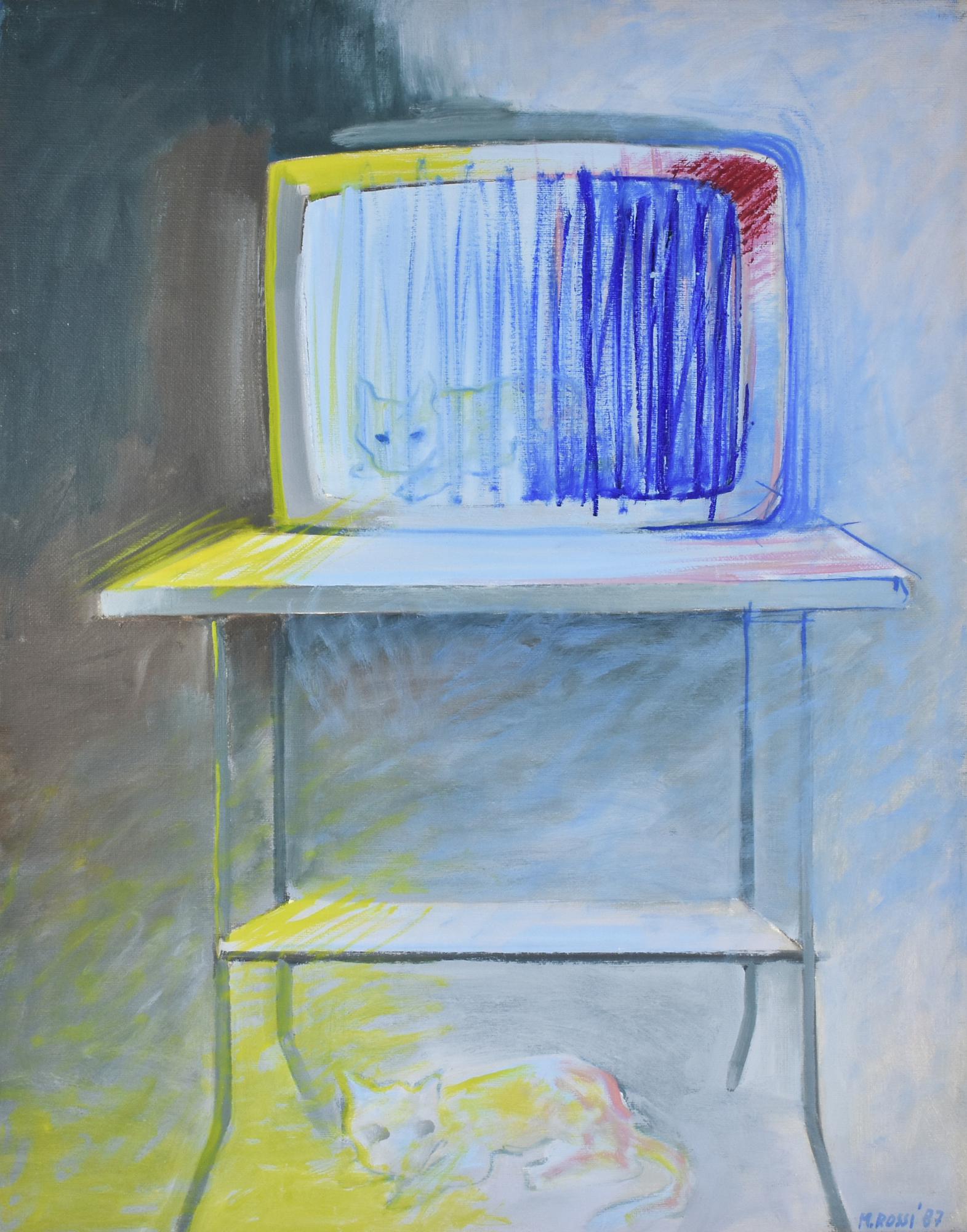 M. Rossi GATTI E TV olio su tela, cm 93x72 firma e data eseguito nel 1987