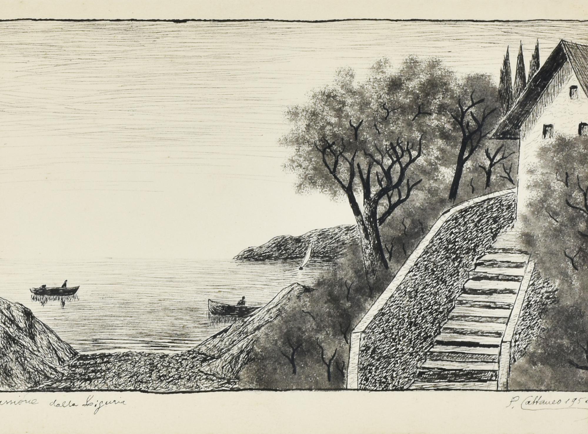 Lotto 129 | P. Cattaneo IMPRESSIONE DALLA LIGURIA matita su carta, cm 18x24 firma e data...