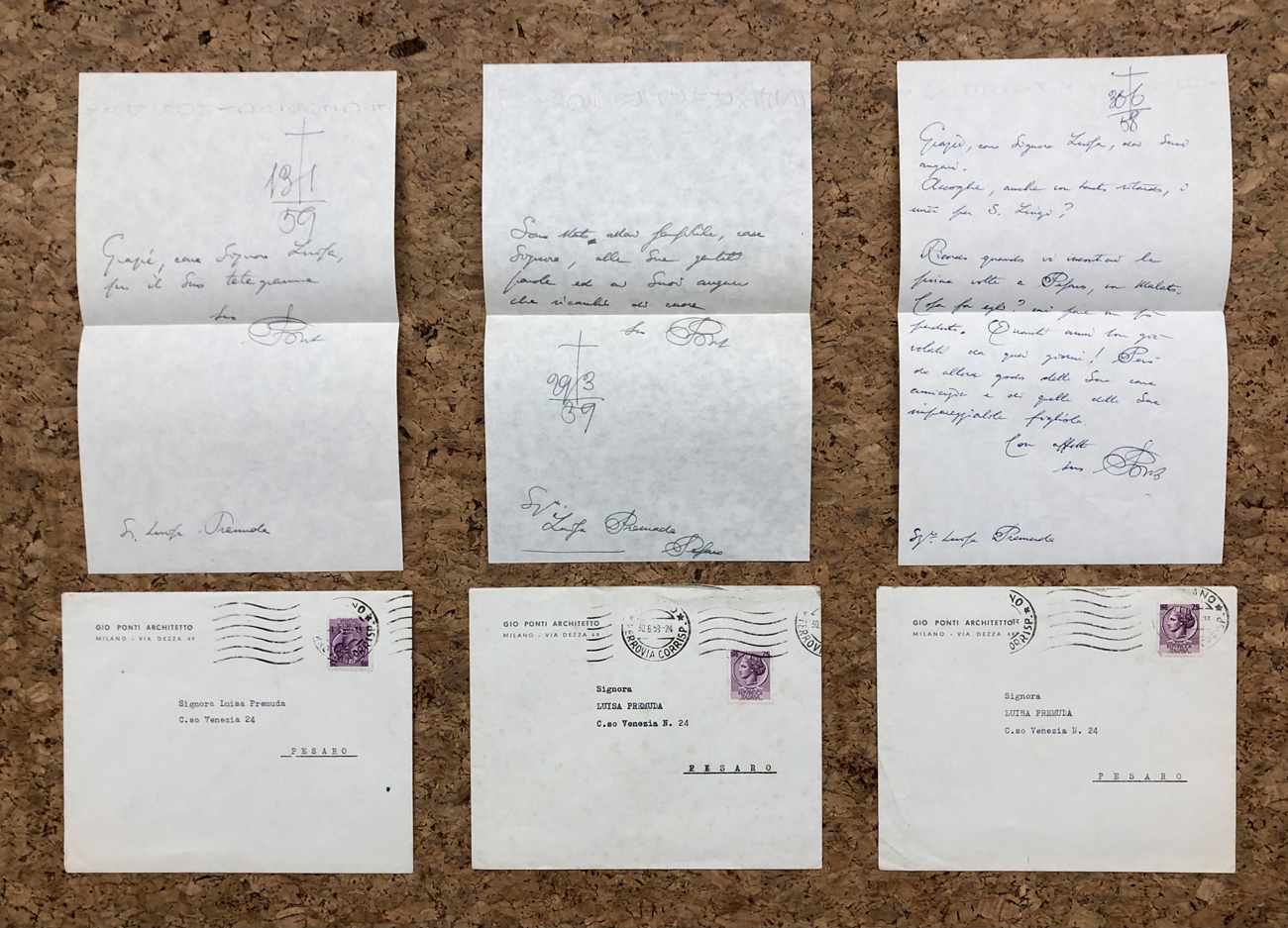 Lotto unico composto da 3 lettere scritte a mano da Giò Ponti indirizzate all'Artista Luisa Premuda complete di buste intestate "Gio Ponti Architetto" e affrancate