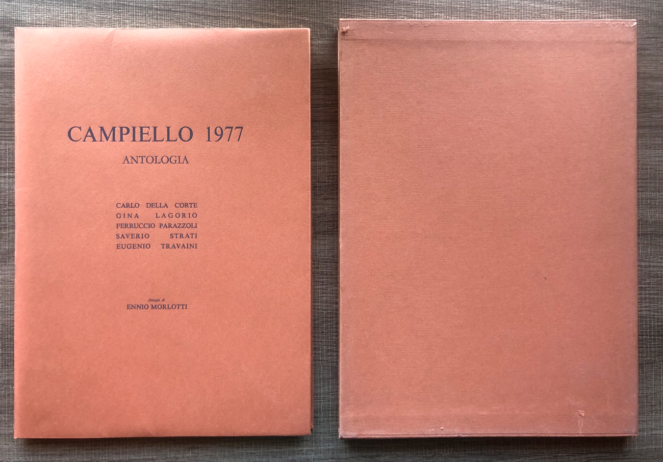 Volume contenente 5 fotolitografie di Ennio Morlotti, ciascuna recante firma in lastra, e un'antologia di testi di Carlo Della Corte, Gina Lagorio, Ferruccio Parazzoli, Saverio Strati e Eugenio Travaini