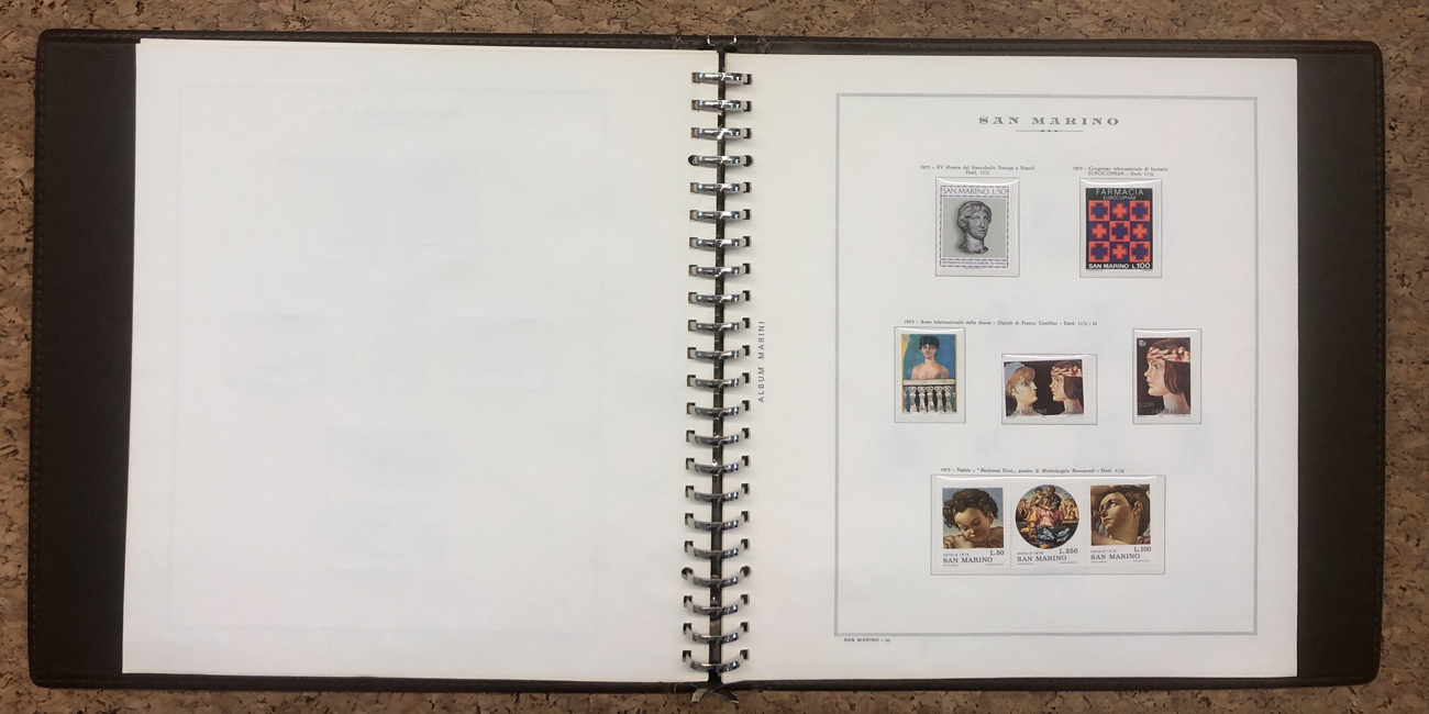 - Raccoglitore contenente una collezione di 70 francobolli di San Marino editi tra il 1975 e il 1977