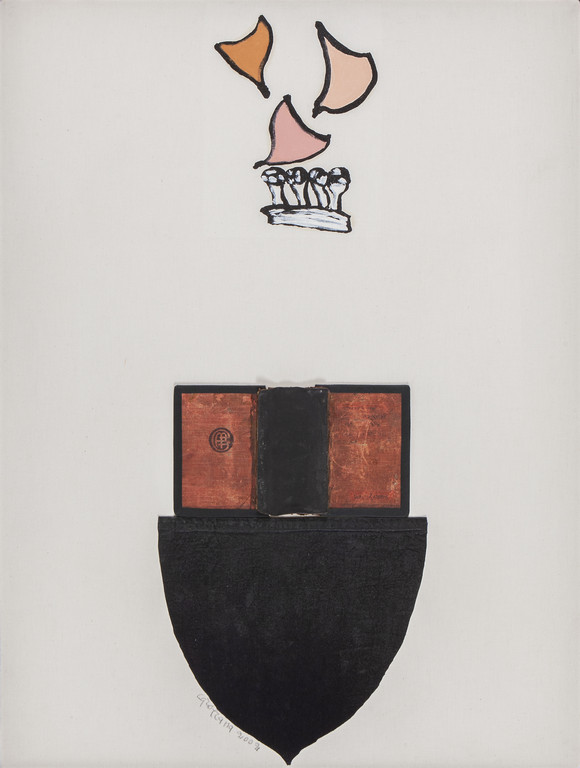 oil aquatint fabric and book cover on canvas 31 29x23 62 in