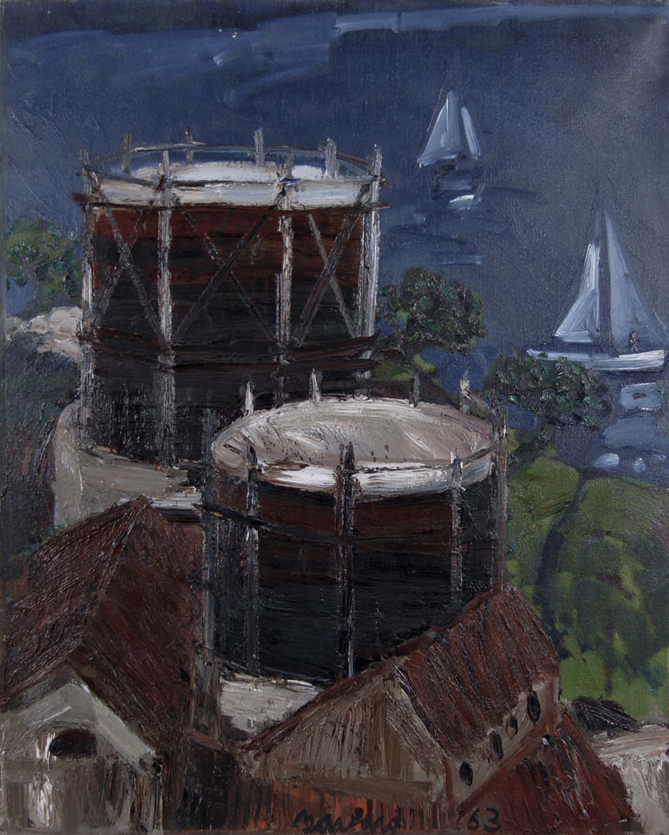 BARBARO SAVERIO Venezia 1924 Due gasometri e barche 1963 olio su tela 100x81...