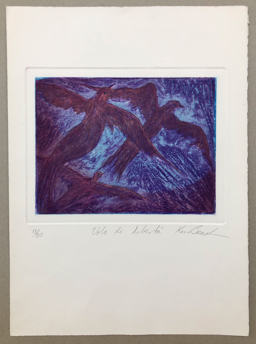 - Kim Elizabeth Beachen. Volo di libertà. Acquaforte, cm 34,5x25, firma, titolo e numerazione 11/30 a matita al fronte