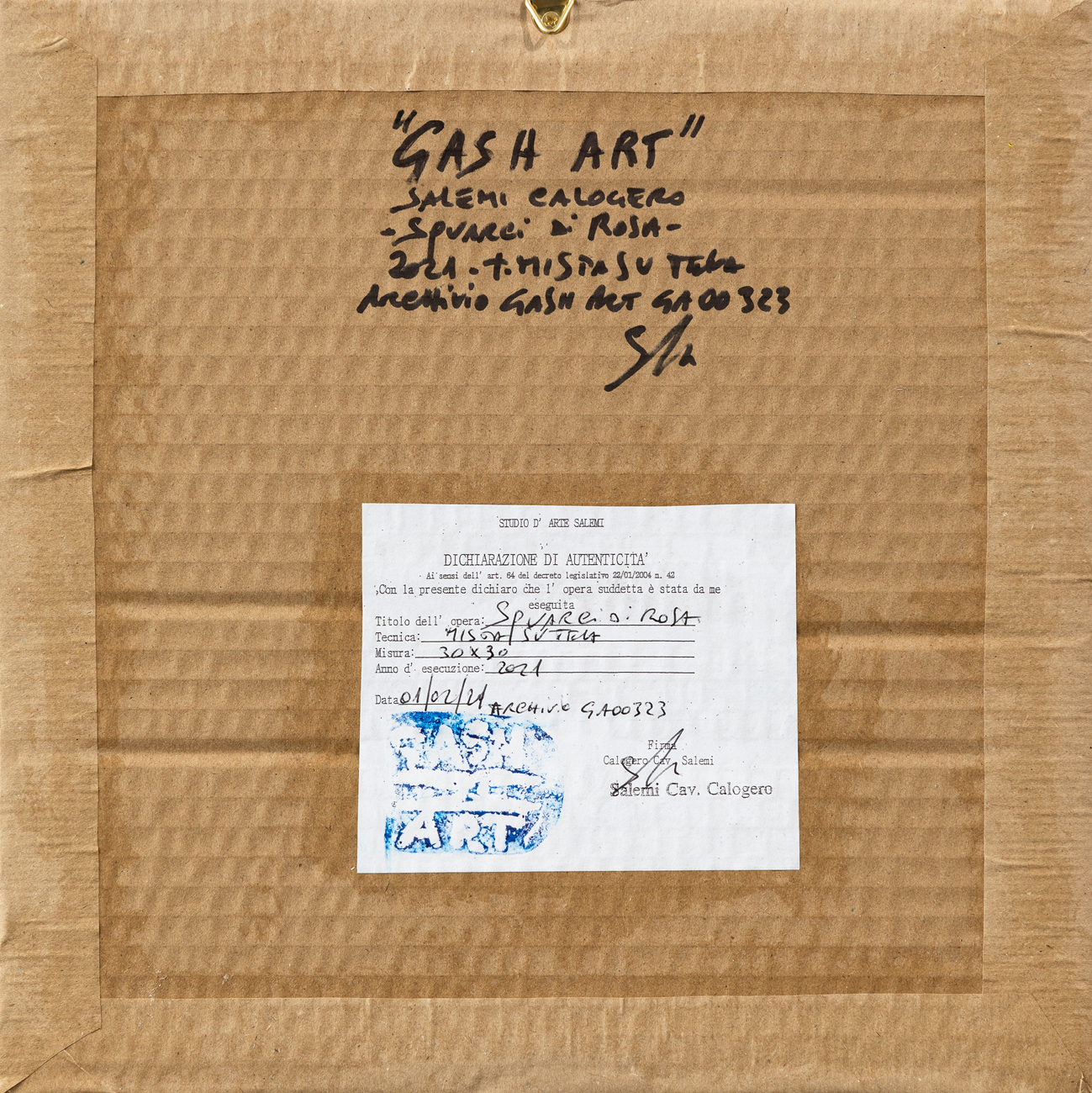 Firma, titolo, datazione, misure, tecnica, numero di archivio ed etichetta dell'Artista al retro