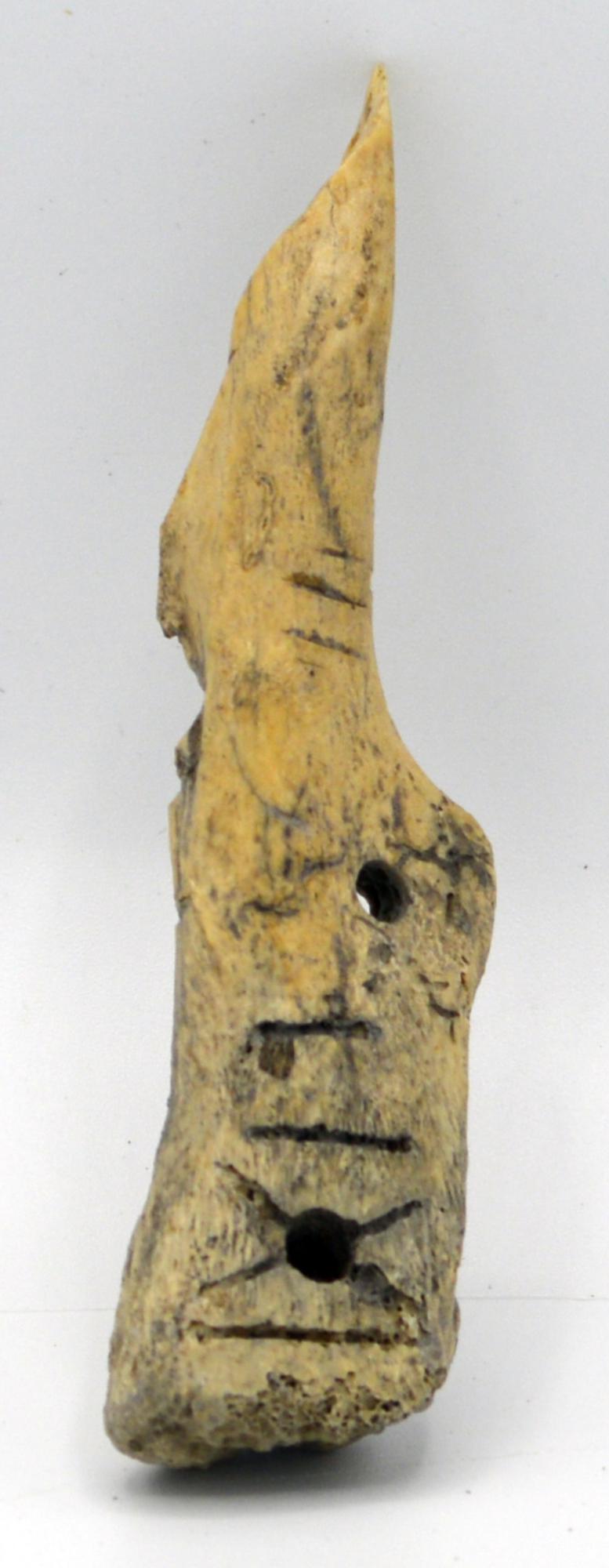 Scheggia d'osso con due fori per la sospensione, decorata ad intaglio a motivi geometrici.