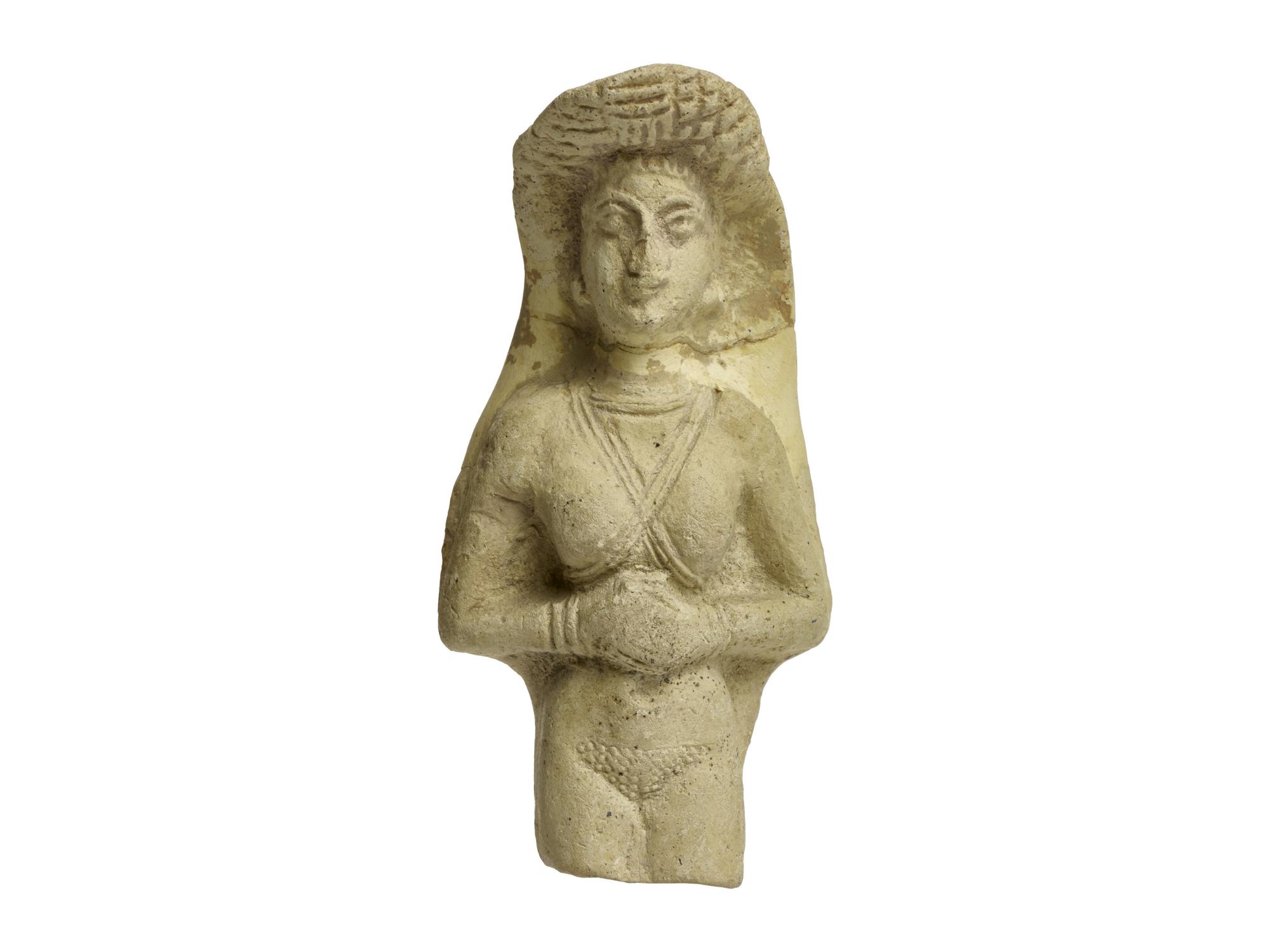 Figura femminile nuda con capigliatura a boccoli che scende sulle spalle; le mani sono incrociate sul ventre, seni e pube in evidenza. E' priva della parte inferiore delle gambe.