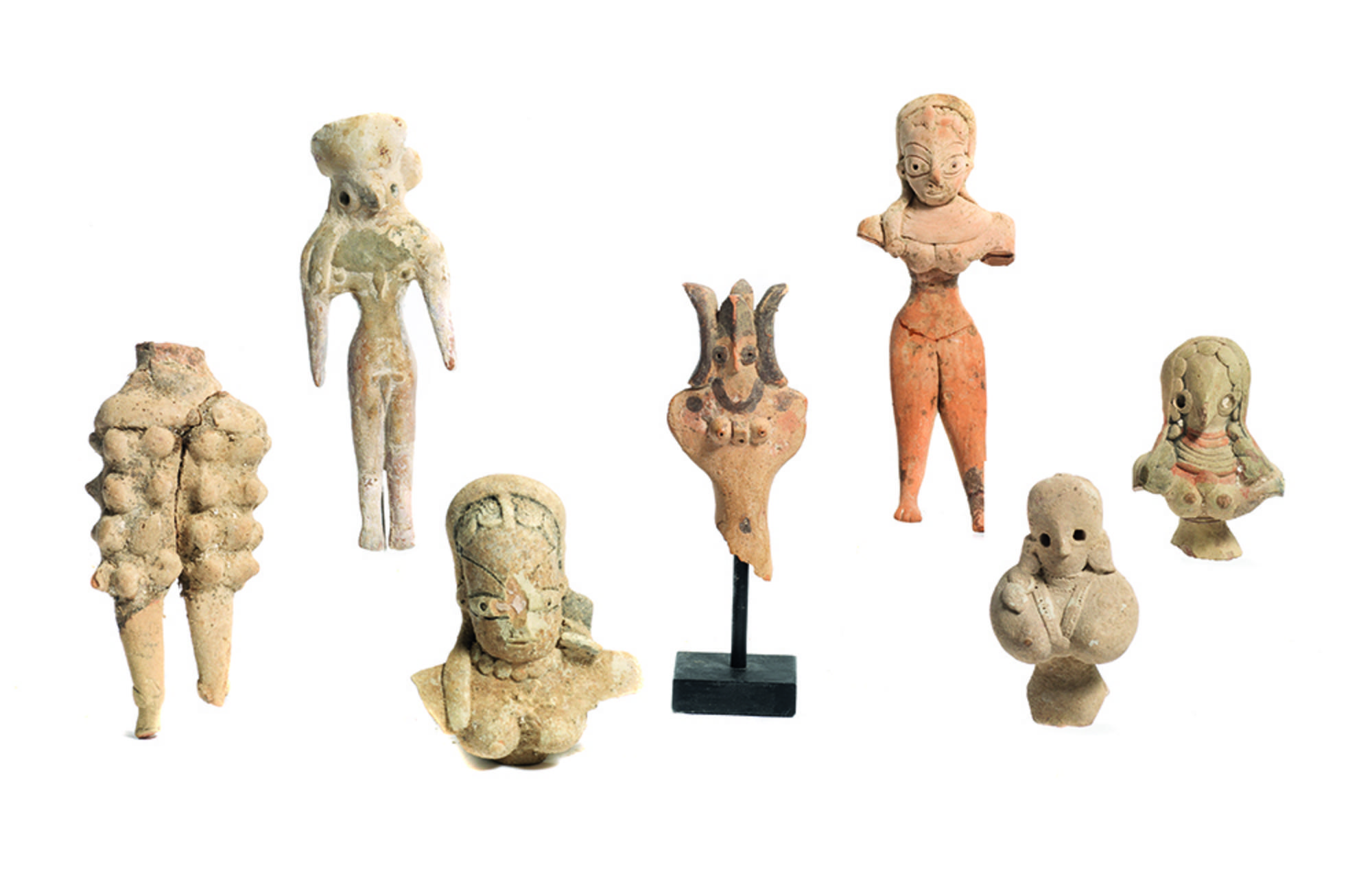 stante; cinque statuette frammentarie stanti raffiguranti la Dea Madre nuda con collane, teste stilizzate con becchi di uccello, elaborata acconciatura, grandi seni e con braccia protese e parte inferiore di statuetta con pantaloni con bugne coniche (7)