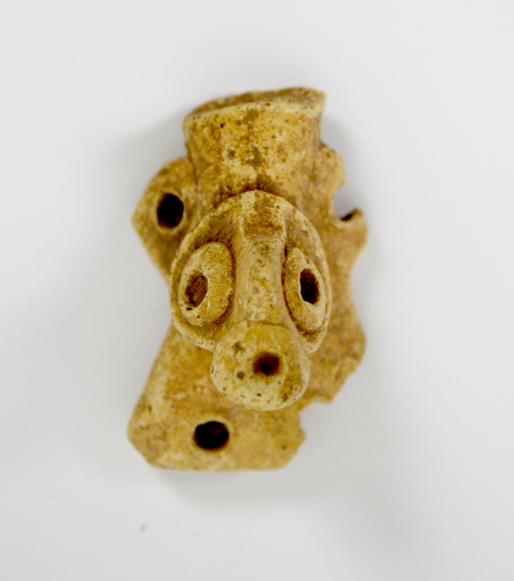 Testa femminile stilizzata stante in posizione frontale; il volto è dominato dal grande naso che termina con un cerchiello applicato come gli occhi.