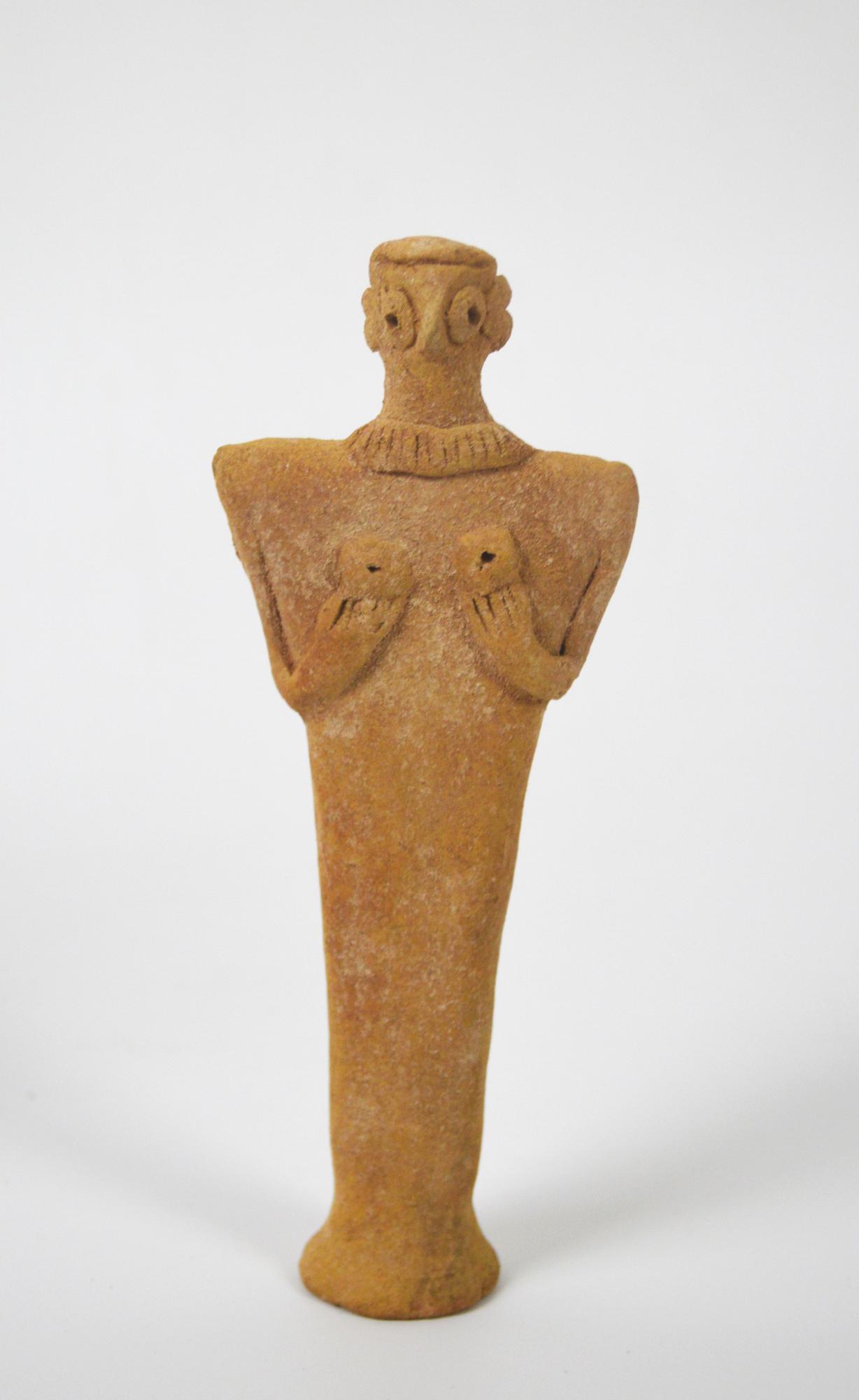 Figura femminile stilizzata stante in posizione frontale con le braccia ripiegate a sostenere il seno; il volto è dominato dal grande naso a becco d'uccello, gli occhi ed i seni sono applicati; la lunga veste scende fino al suolo.