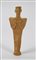 Figura femminile stilizzata stante in posizione frontale con le braccia ripiegate a sostenere il seno; il volto è dominato dal grande naso a becco d'uccello, gli occhi ed i seni sono applicati, la capigliatura e la collana sono evidenziate da tratti incisi; la lunga veste scende fino al suolo.