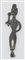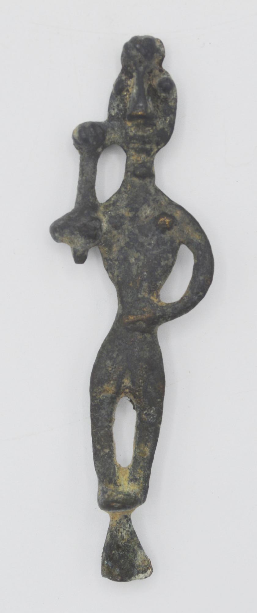 Statuetta stilizzata in bronzo raffigurante divinita' maschile in posizione stante con testa ovale, grande naso e occhi globosi, braccio destro sollevato ad impugnare una mazza e sinistro portato sul fianco; gambe divaricate e piedi uniti; su piccola base conica.