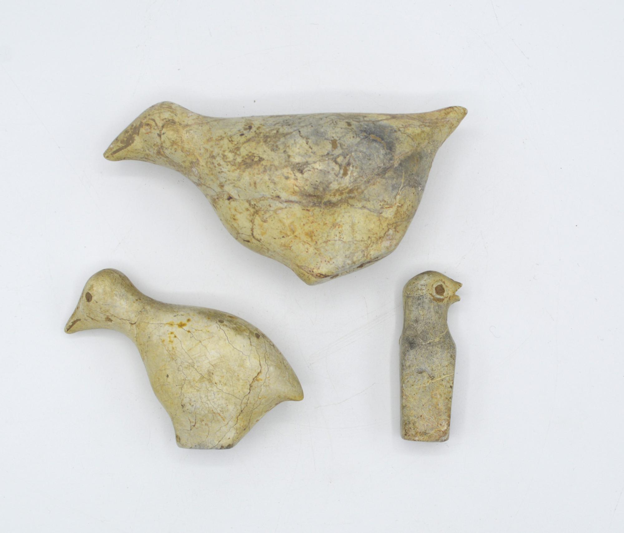 Tre statuette raffiguranti volatili stanti, due naturalisticamente, la terza costituita solo dalla testa su una base a parallelepipedo; nella parte inferiore sigillo a figura umana seduta. (3)