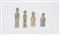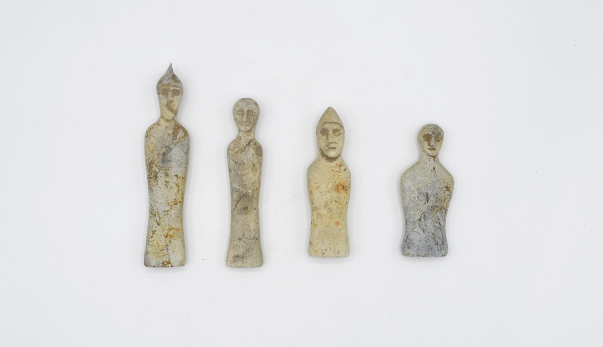 Quattro statuette maschili con corpi stilizzati, completamente avvolti nei mantelli; due con cappello conico a punta e volto con barba appuntita; le altre due con cappello abbassato posteriormente sul collo; alla base della statuetta sigillo con volatile stilizzato. (4)