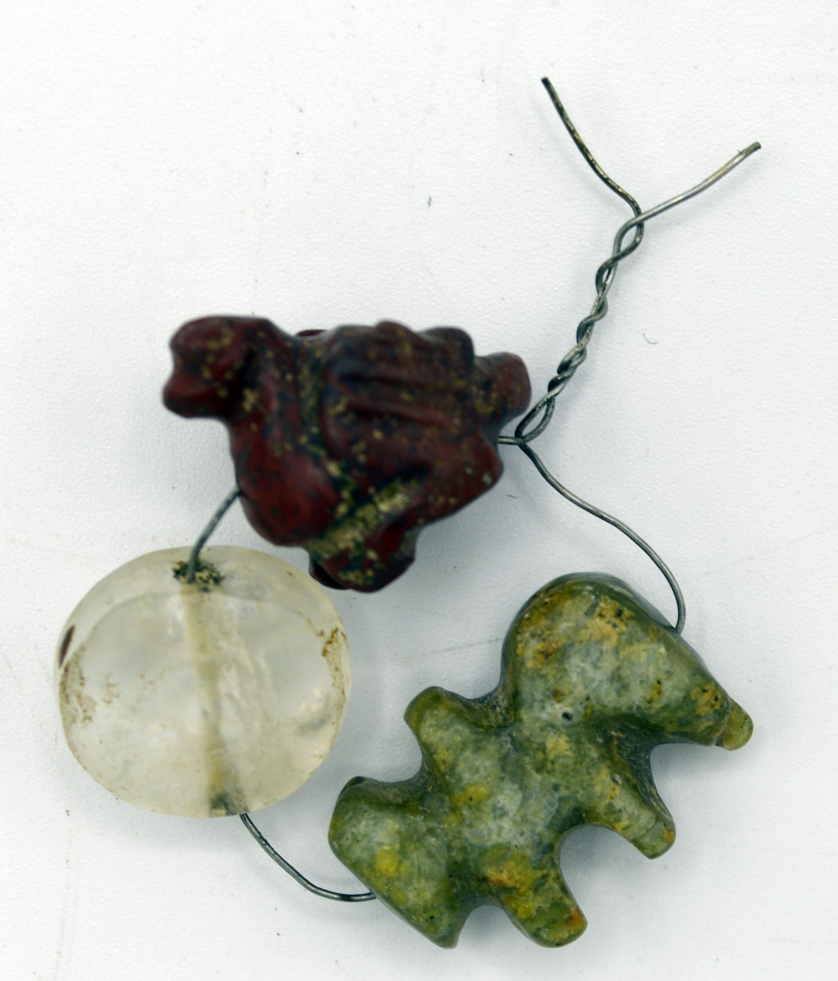 Tre piccoli pendenti di cui due raffiguranti animali stilizzati ed una perla in cristallo di rocca. (3)
