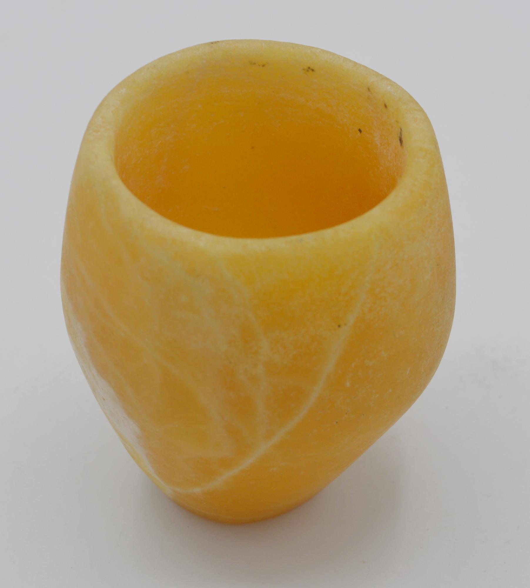Coppetta in alabastro con labbro ingrossato, vasca globulare.
