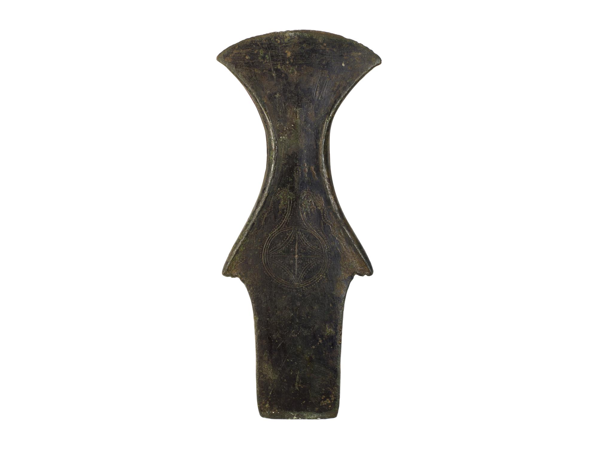 Ascia piatta in bronzo con tacche d'arresto; verso il tagliente i margini sono abbastanza accentuatamente rilevati e fortemente concavi. Sulla superficie tra le tacche d'arresto e su quella sottostante si staglia un motivo decorativo inciso: due cerchi concentrici con croce inscritta. I vertici della croce sono poi uniti tramite due archi di cerchio marginati da punti incisi. Un terzo e un quarto cerchio, l'uno a tratto, l'altro puntinato, si aprono in basso e ricurvano in su verso i margini dell'ascia. La linea puntinata continua poi con andamento ondulato, fino alle tacche d'arresto