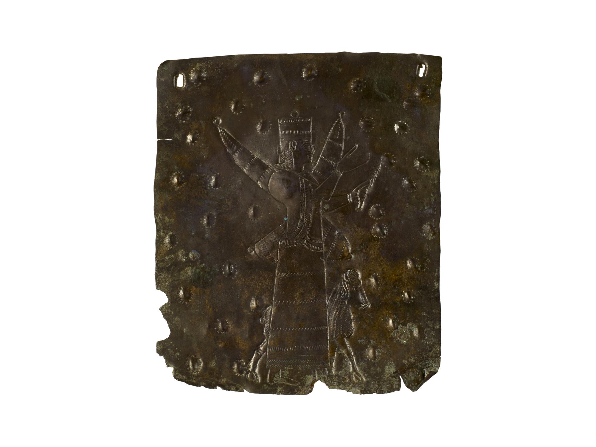Placca di bronzo laminare con raffigurazione, a sbalzo e bulino, di divinità con tiara cilindrica priva dell'attributo delle corna, gradiente a sinistra, abbigliata con veste ricamata lunga fino a terra. Nella sinistra regge un ramoscello mentre la destra è sollevata in segno di saluto. Reca sulle spalle due faretre porta arco. Al fianco della figura incedente compare un ariete.