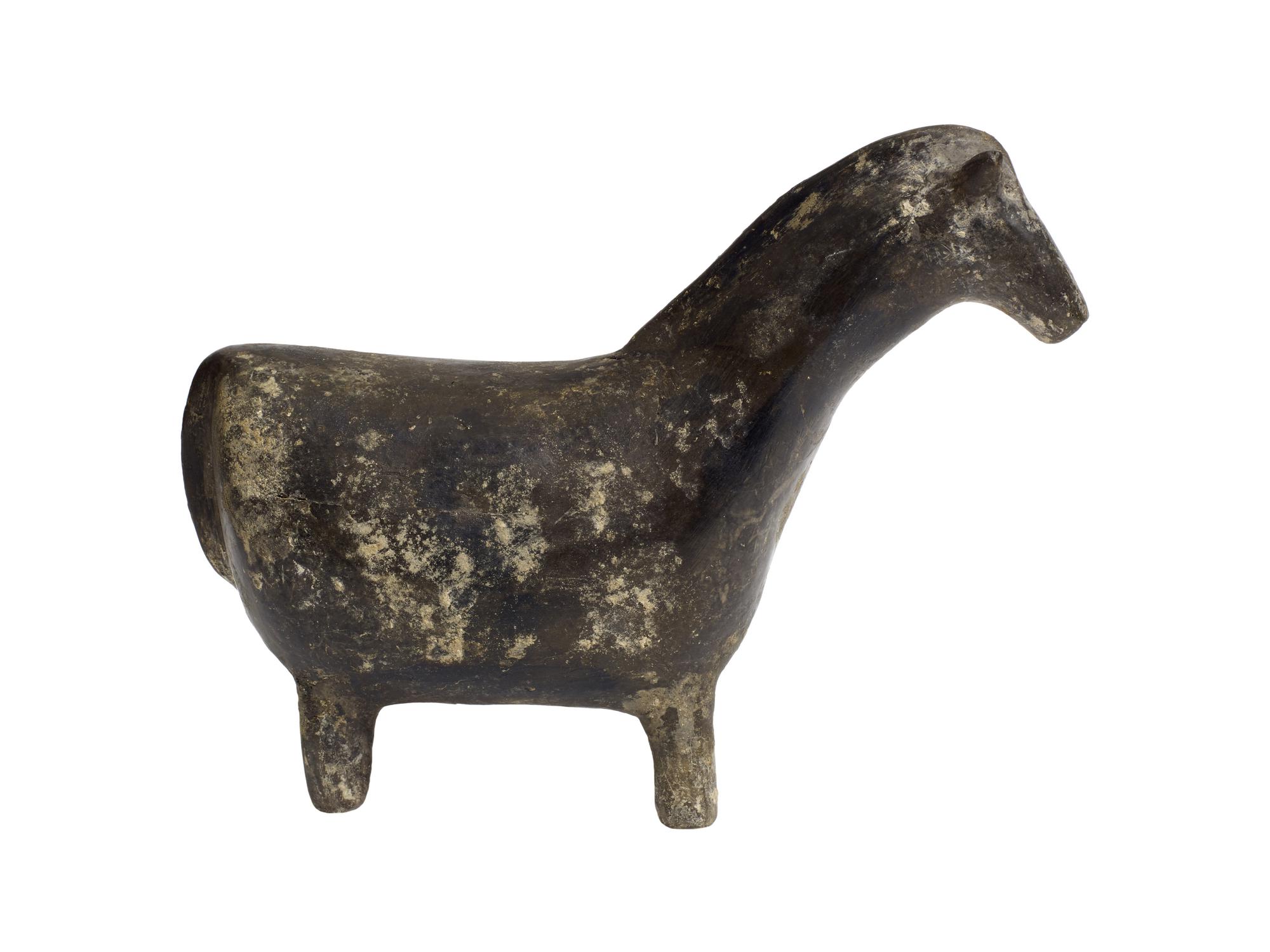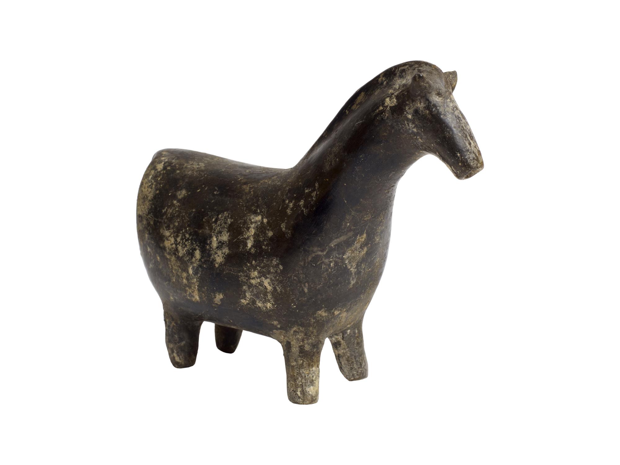Scultura raffigurante un cavallino in ceramica d'impasto scuro, superfici brunite traslucide. Struttura corporea massiccia; zampe tozze, cortissime.
