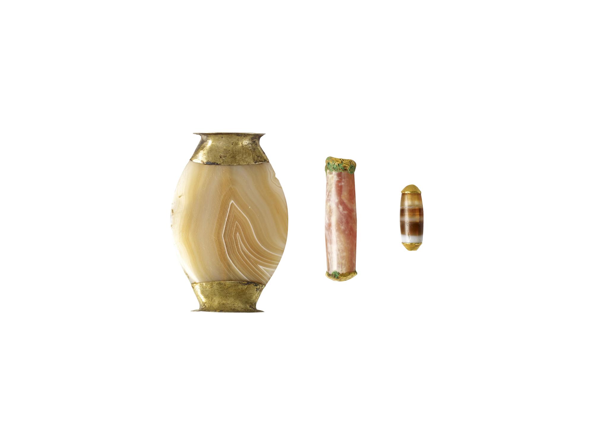 Tre vaghi di collana in agata e calcedonio, due cilindrici e l'altro di forma ellittica schiacciata con le estremità rivestite in lamina d'oro
