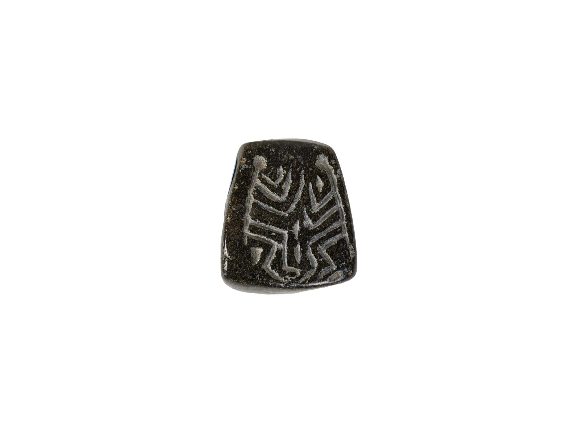 Sigillo a stampo tronco piramidale in granito nero con raffigurati due personaggi seduti uno di fronte all'altro con le braccia protese e piegate in alto. Tipico sigillo iranico della fine del IV millennio a.C. che trova confronti tra i reperti di Tepe Giyan e Tepe Hissor.