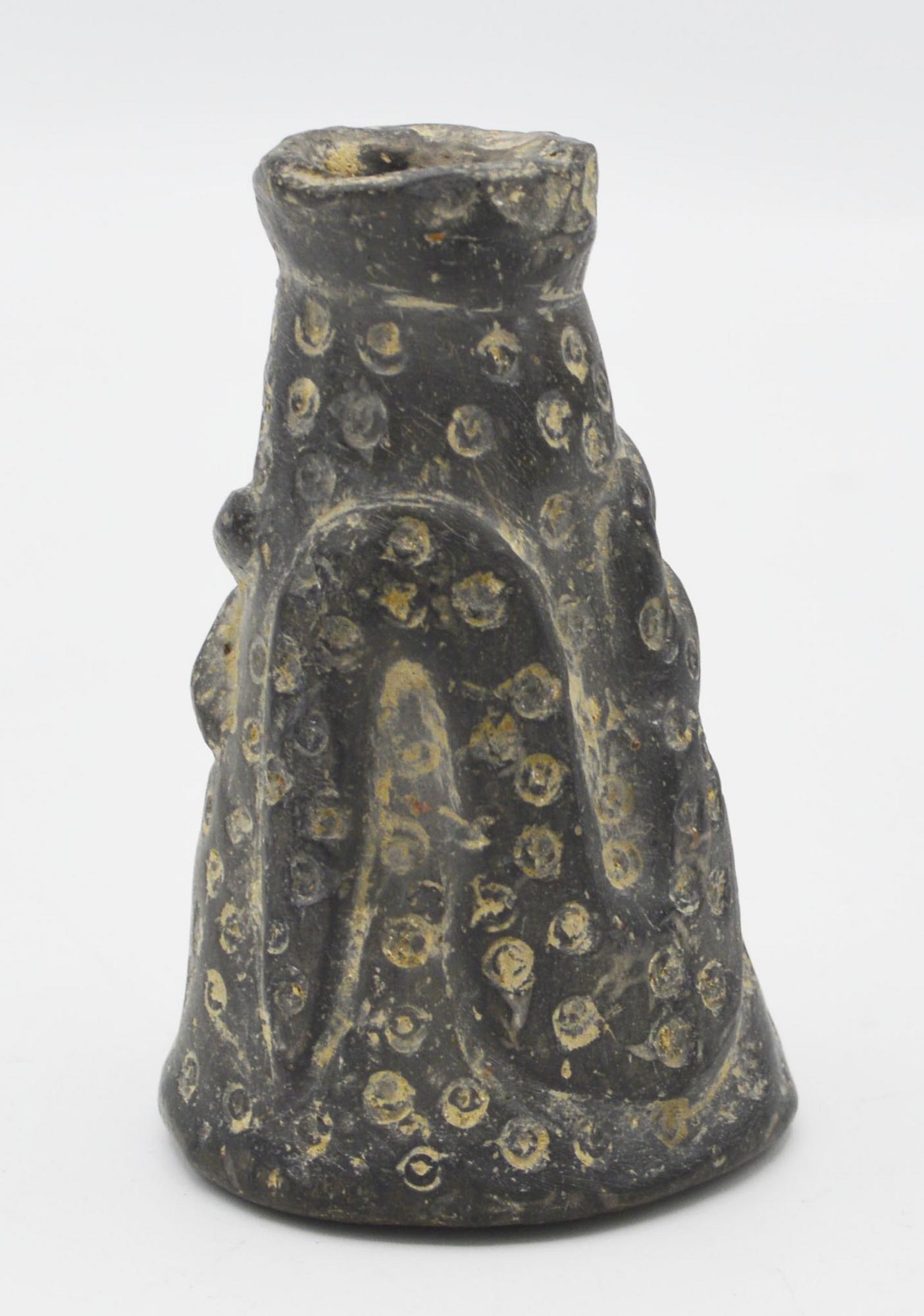 Vaso di forma troncoconica con fondo piatto decorato a cerchielli incisi e con un grande serpente con la bocca aperta che vi si avvolge.