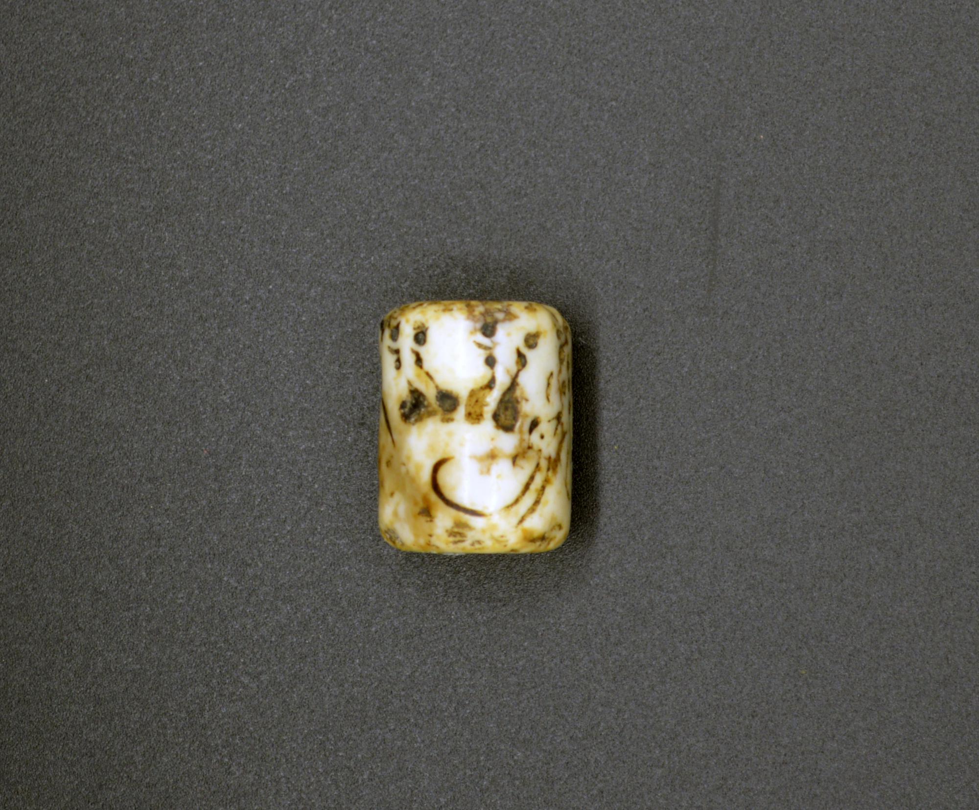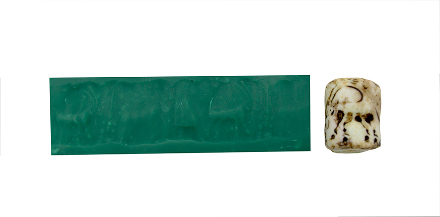 Sigillo cilindrico in pietra bianca che rappresenta due capridi rivolti verso destra; tra loro e' presenta la montagna con l'albero sacro e una terza figura, ma quest'ultima risulta irriconoscibile a causa del degrado del supporto inciso.