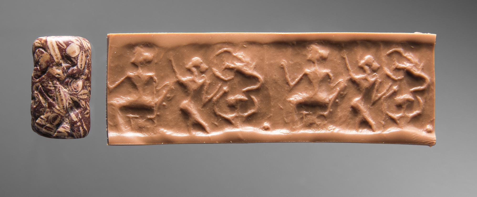 Sigillo cilindrico sul quale sono rappresentate tre figure antropomorfe: una e' seduta, mentre le altre due affrontano uno scorpione. Sia le figure umane sia lo scorpione sono resi in modo molto schematico.
