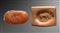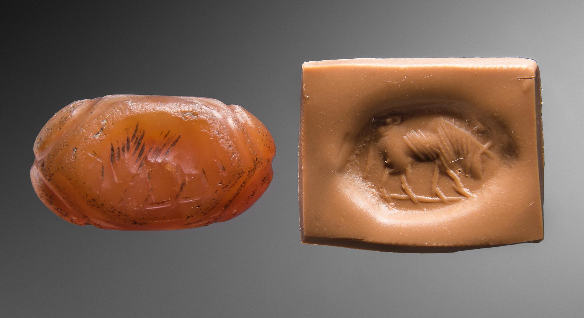 Sigillo globulare a stampo con due lati appianati e una larga perforazione trasversale e base ovale. Il retro e' decorato con un motivo geometrico profondamente inciso. La base e' decorata con la rappresentazione di un bue.