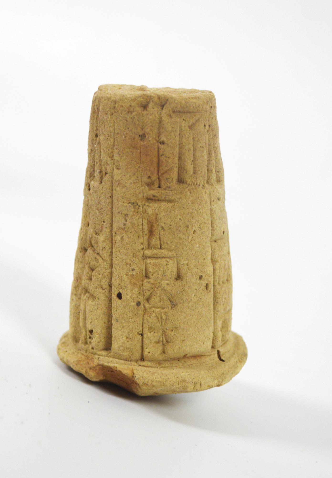 Cono troncoconico con colonne di iscrizione in caratteri cuneiformi.
