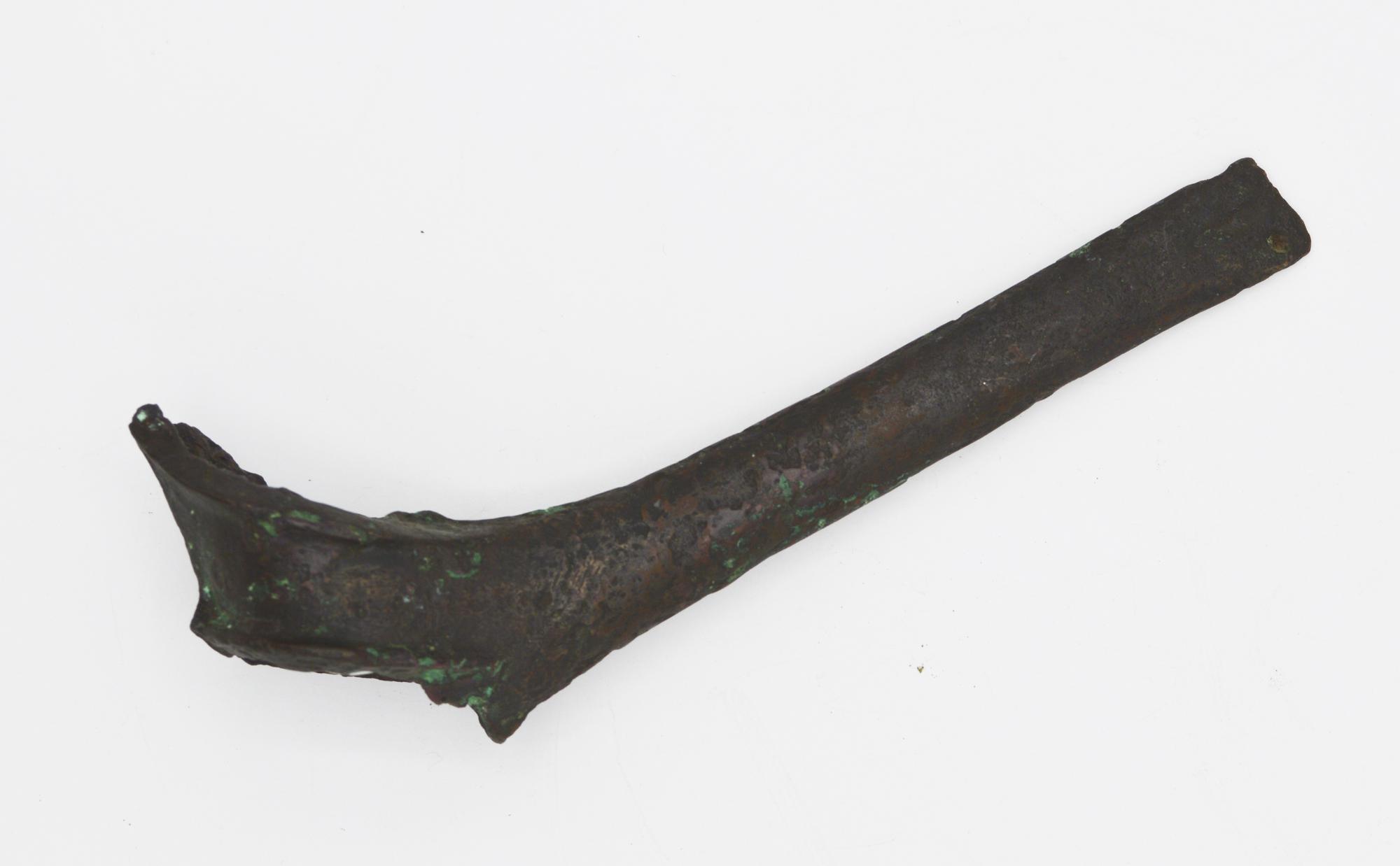 Picca o ascia di bronzo con corto manicotto ellittico a bocche oblique, con margini rigonfi su entrambi i lati.