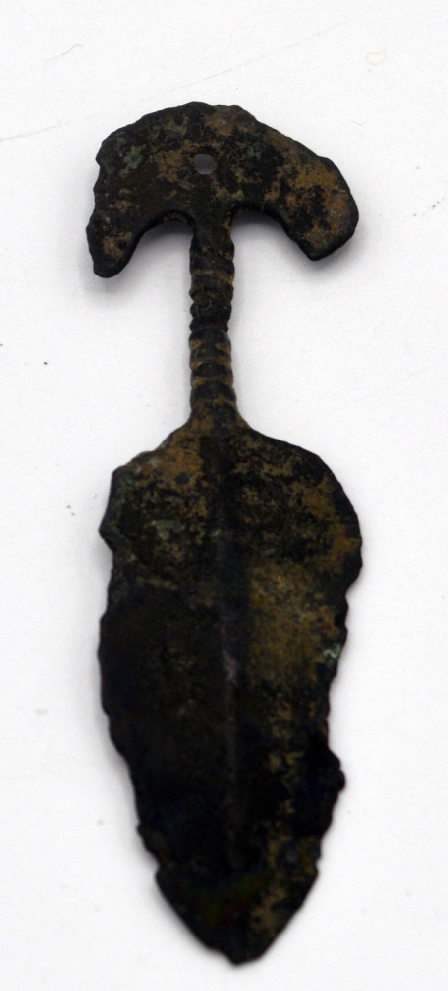 Pugnale votivo miniaturistico con lama triangolare costolata, impugnatura decorata da nervature in rilievo e presa semilunata.