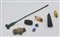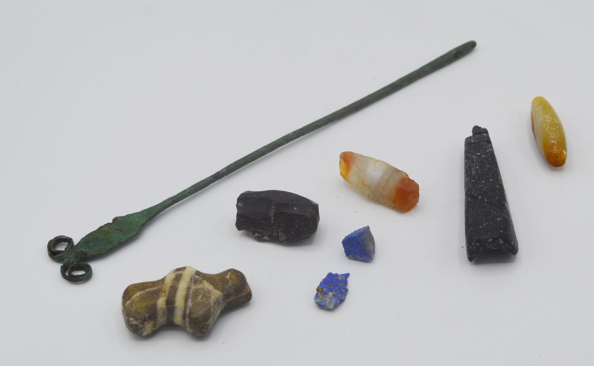 Corredo tombale composto da: spillone in bronzo con estremita' a volute, due sculture o pendenti-ornamenti zoomorfi (Zebu'), cinque vaghi di collana (8)