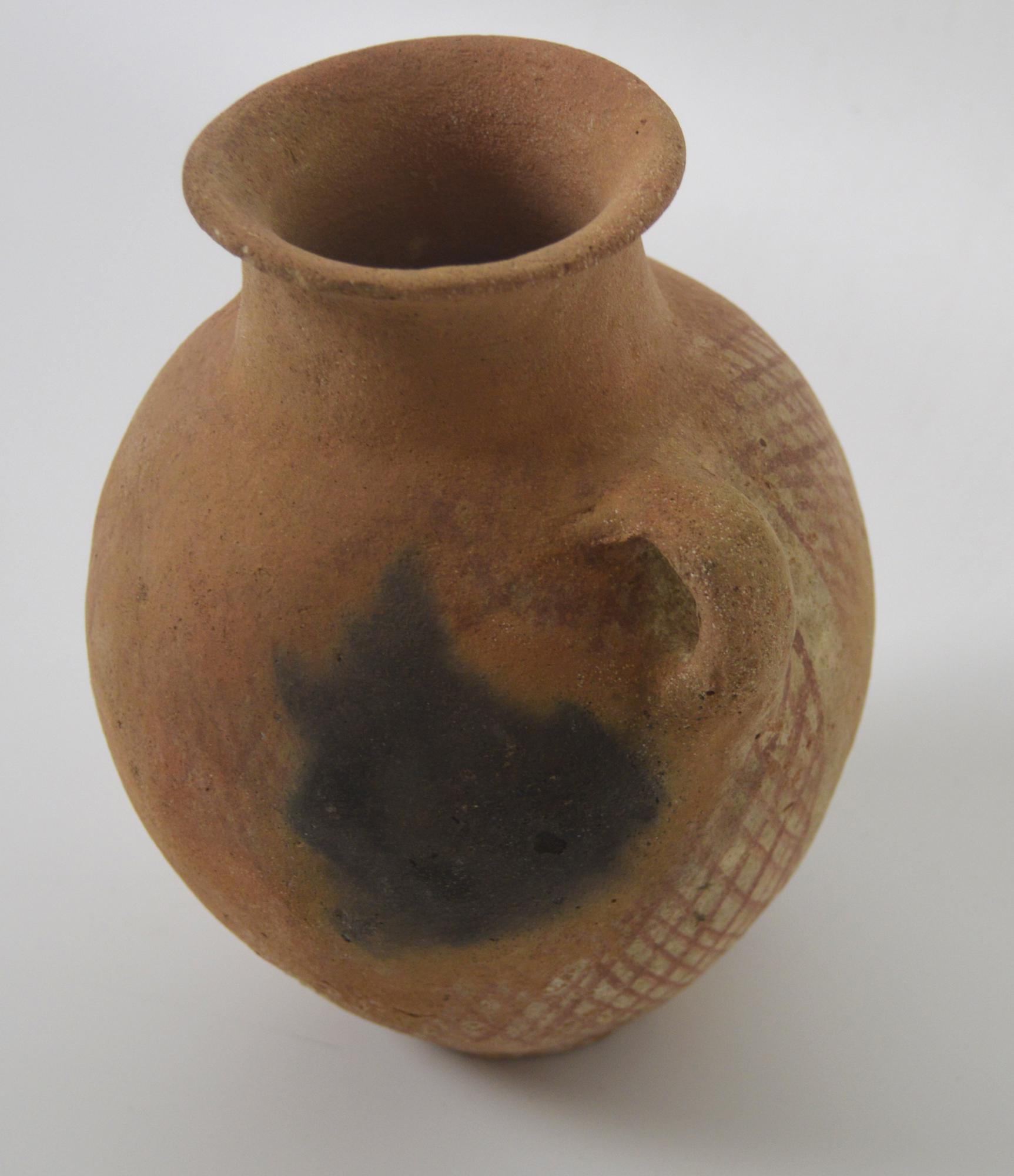 Anforetta con labbro estroflesso, collo cilindrico, corpo ovoide, fondo piatto, anse a nastro impostate verticalmente sulla spalla; decorata con linee in bruno intersecantisi a reticolo.